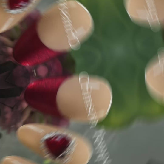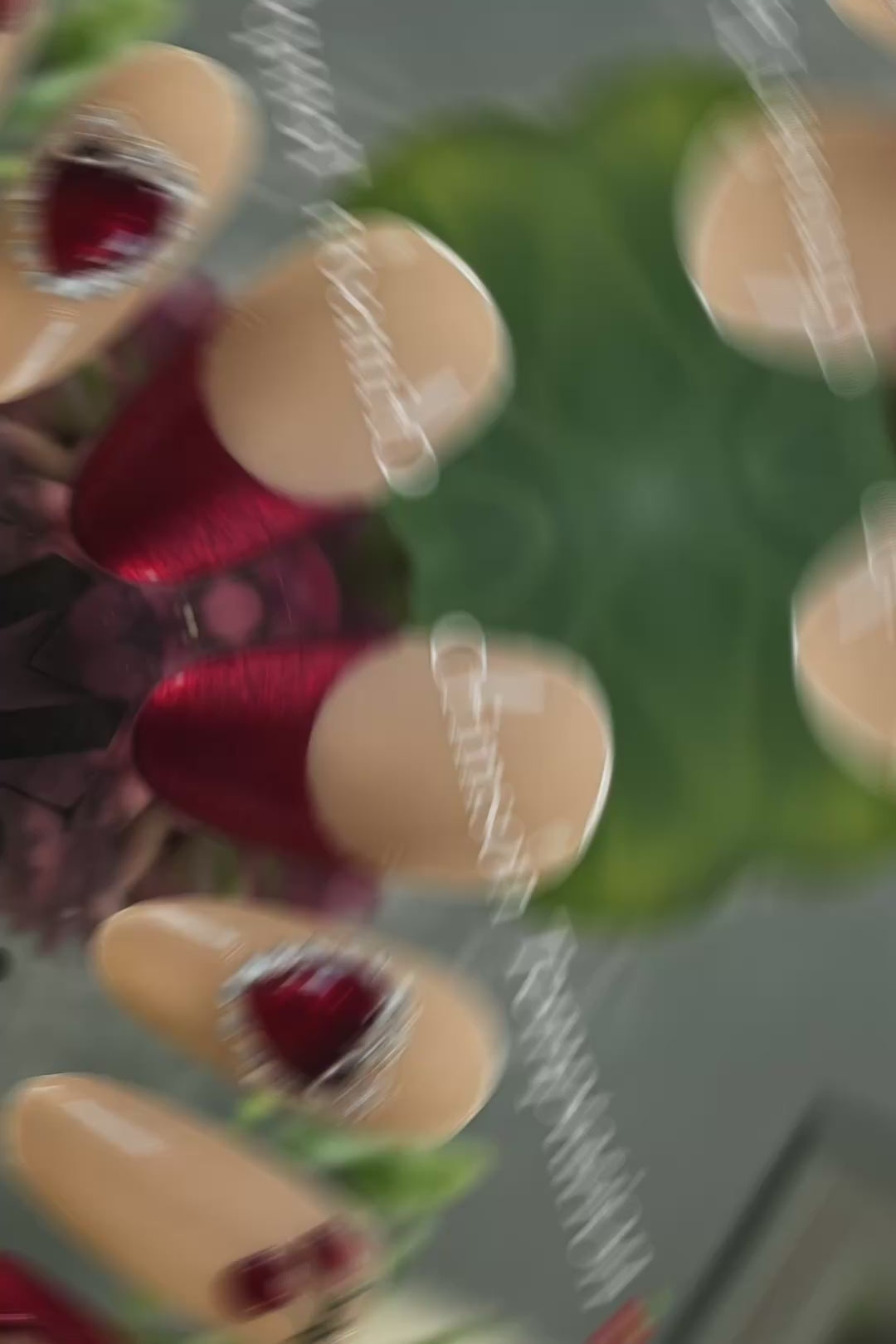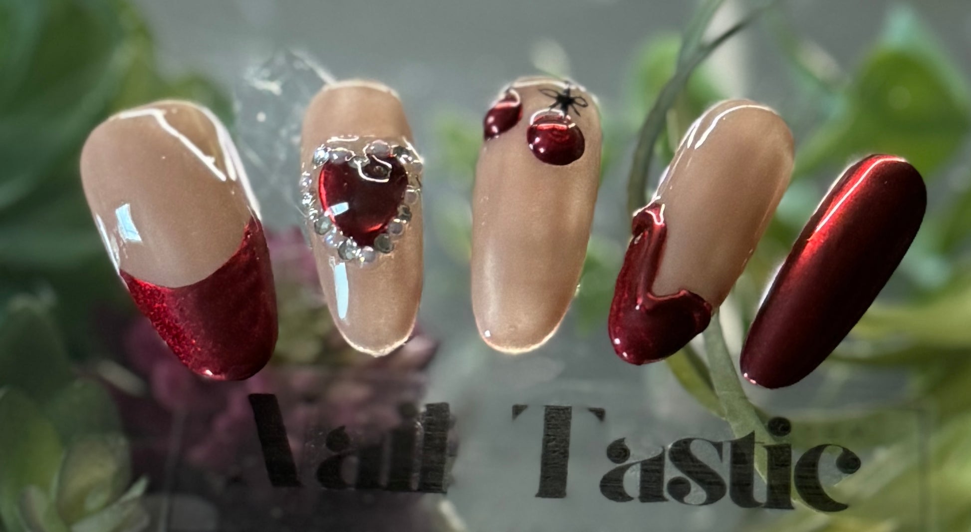 A sultry deep-red chrome meets glossy nude for a bold and sophisticated vibe. Featuring cherry charms, a jeweled heart accent, and dripping red lacquer details—perfect for nights out or flirty holiday looks.