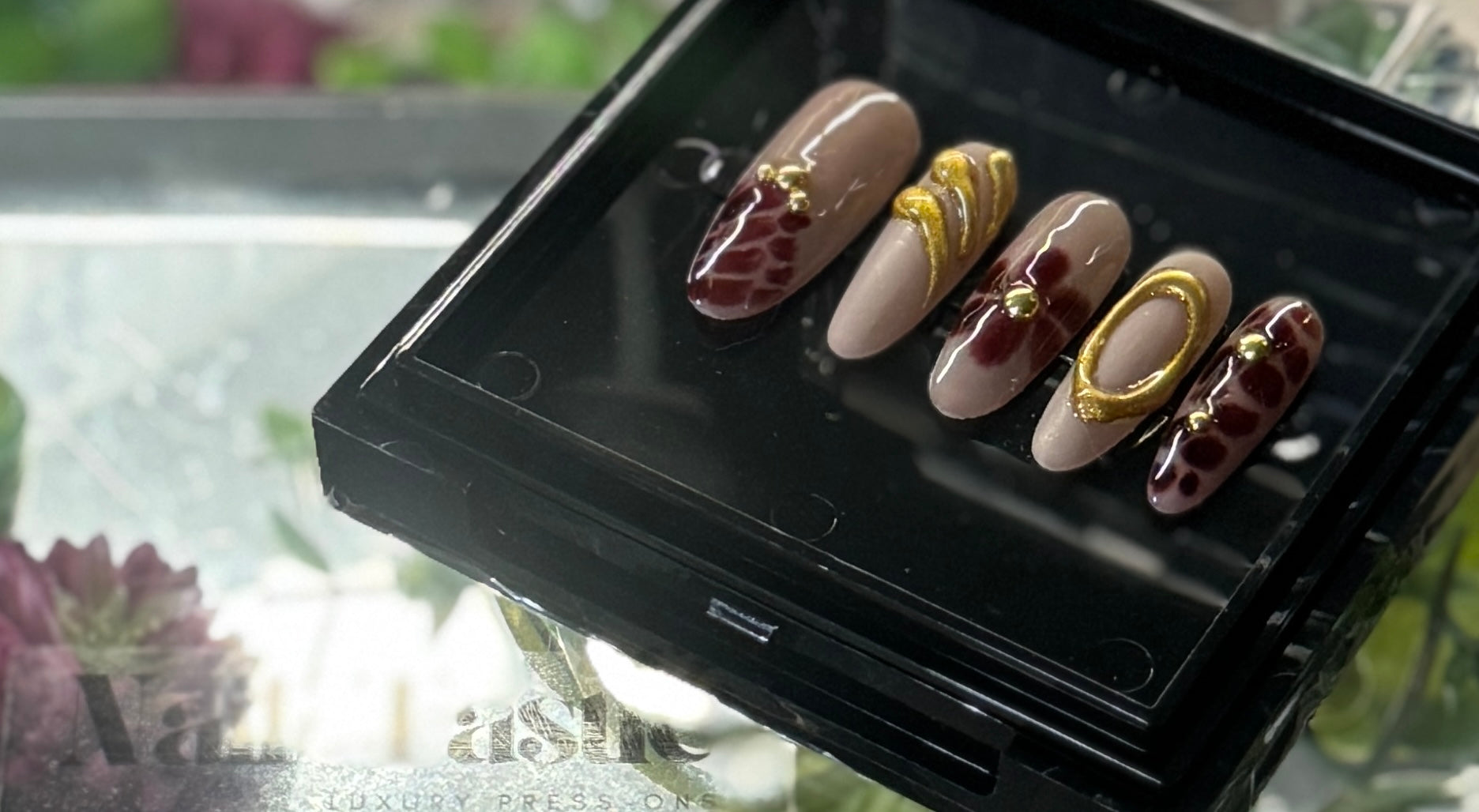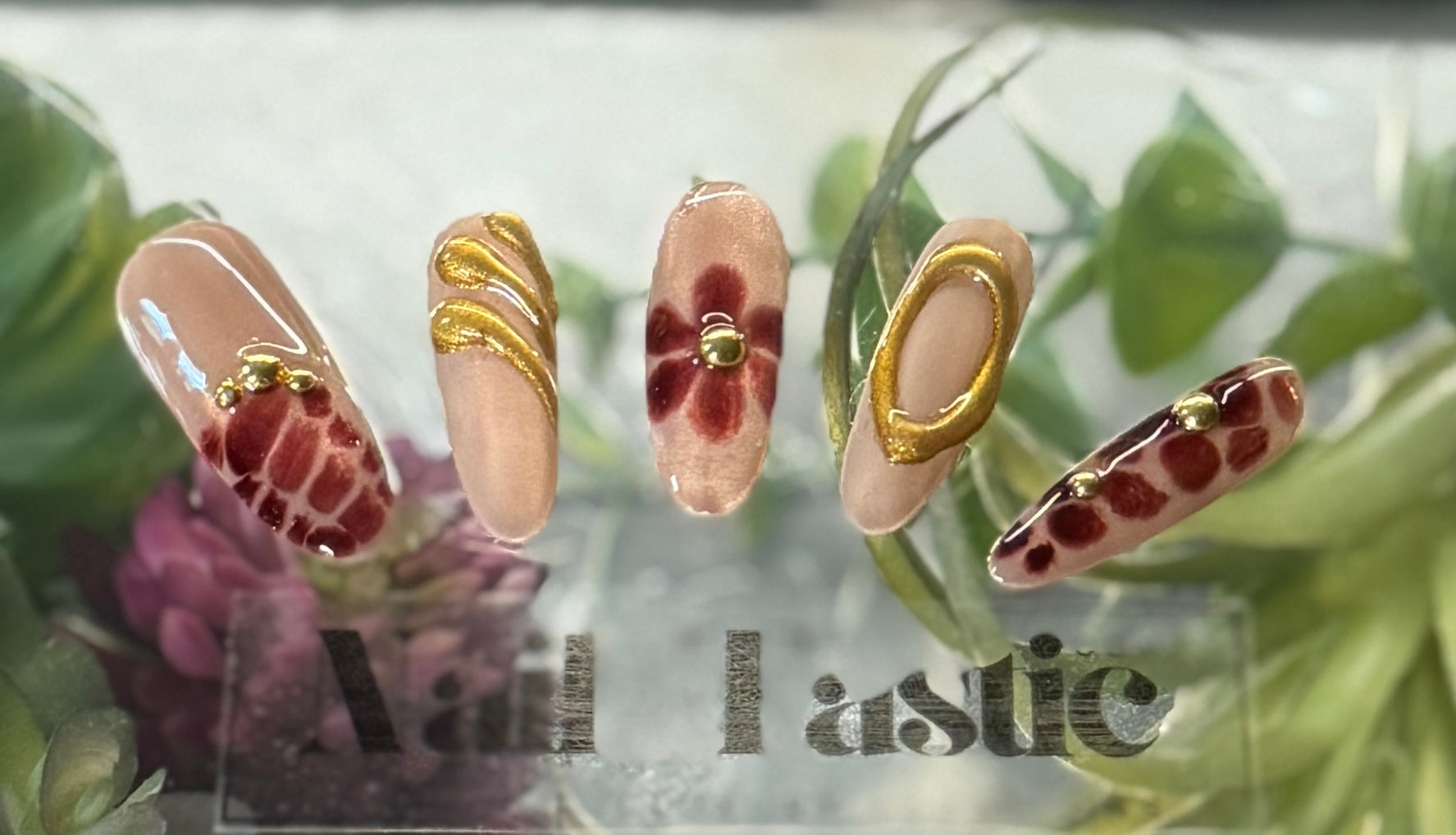 Nude nails adorned with deep maroon safari-inspired animal spots, 3D floral details, and gilded abstract lines. A nature-chic combo for the trendsetter who loves earthy glam.