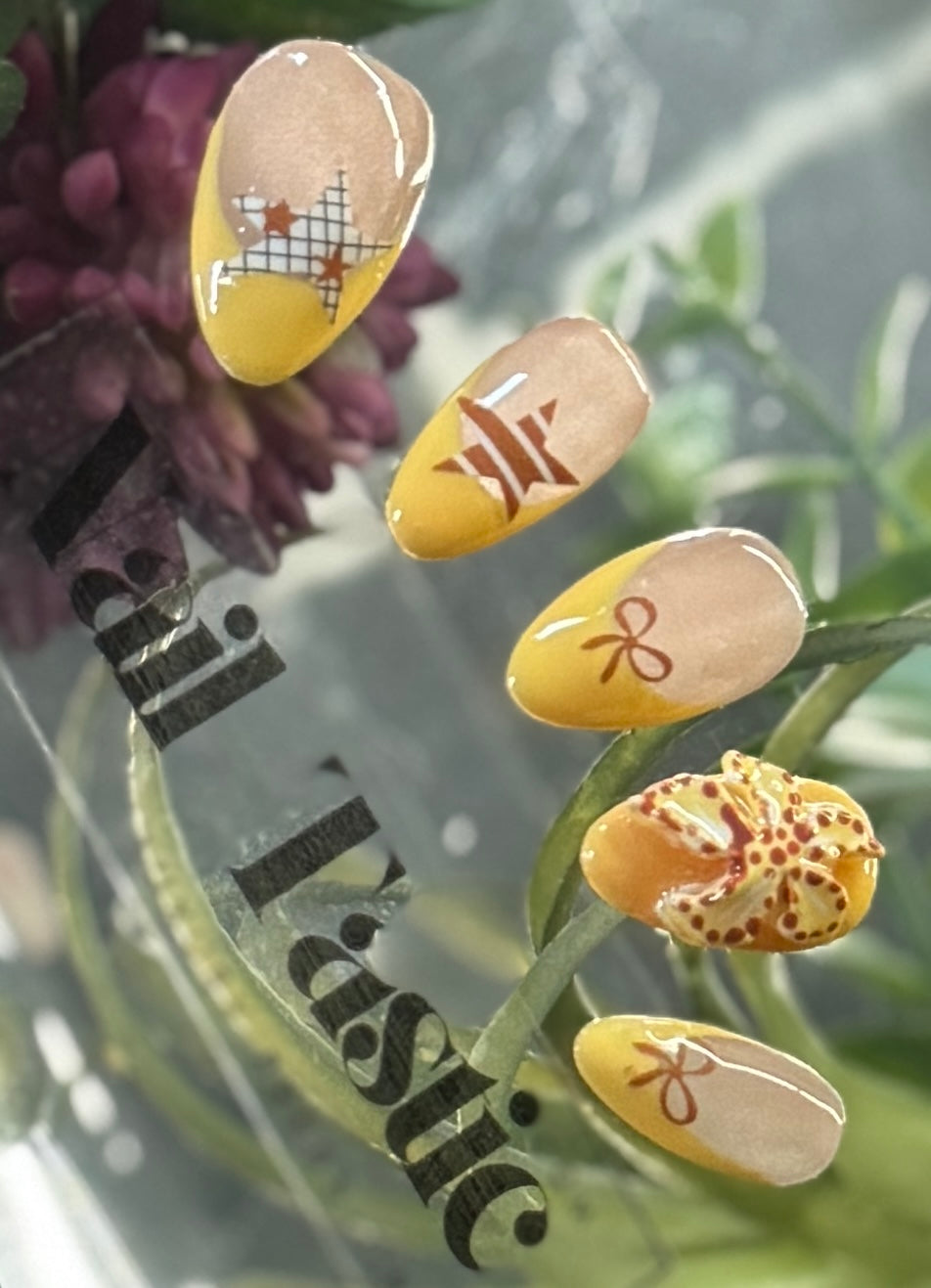 Warm golden-yellow French base with retro star cutouts, ribbon motifs, and a 3D textured flower accent. A playful mix of vintage charm and modern nail art.