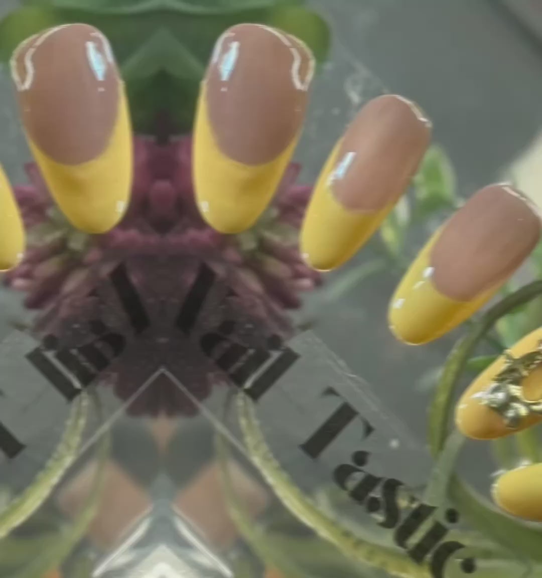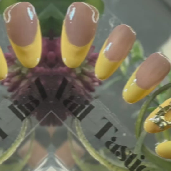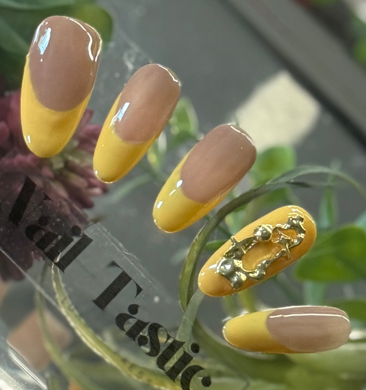 A warm honey-yellow French tip over a soft nude base, accented with a 3D golden abstract charm. Cheerful yet classy—your go-to for sunny vibes all year round.