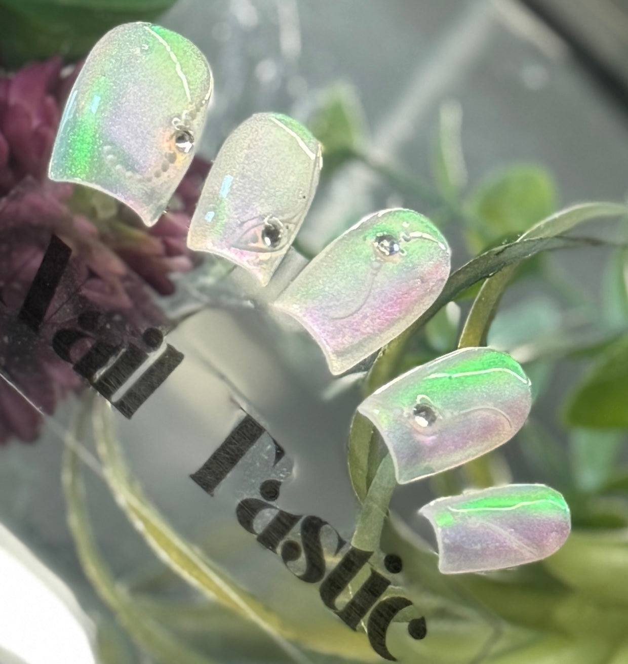 A delicate sheer base with rainbow-hued holographic shimmer and tiny crystal accents. This ethereal set is soft, dreamy, and made for the light to dance off your fingertips.