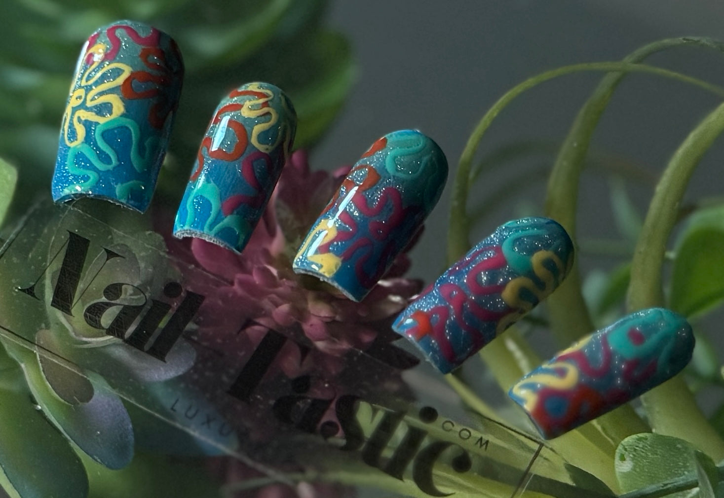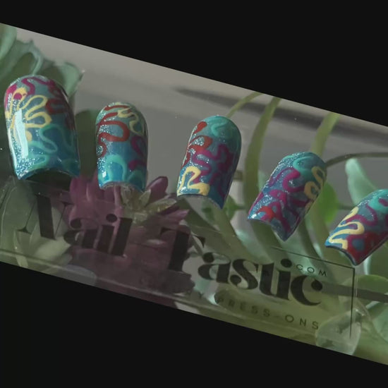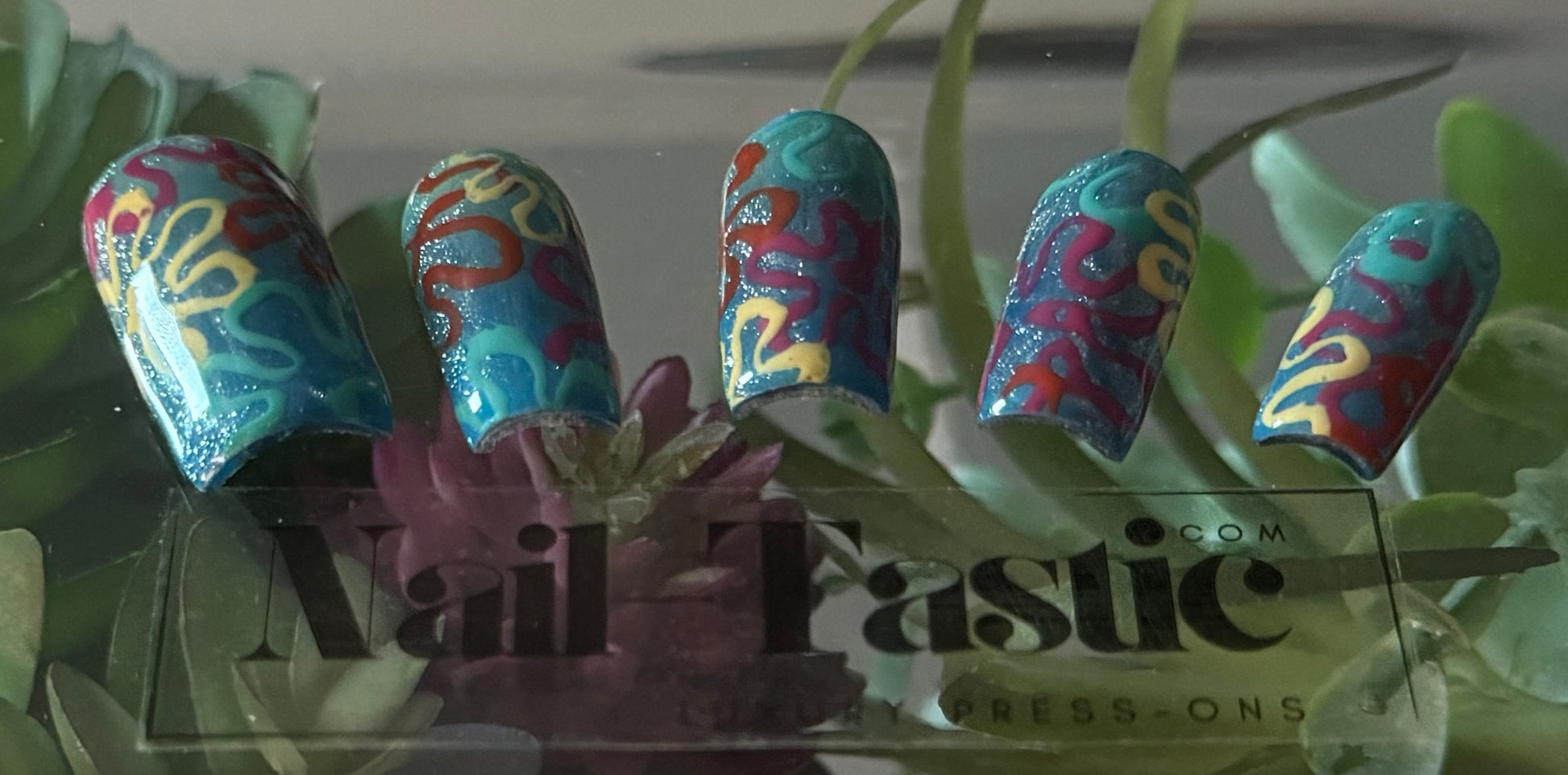 Dive under the sea with this SpongeBob-inspired set! The shimmering ocean-blue base mimics Bikini Bottom’s crystal waters, while the neon pink, yellow, orange, and teal squiggles ripple across each nail like drifting jellyfish trails. A glossy finish and subtle sparkle give it that playful under-the-sea glow—perfect for fans who want a splash of cartoon fun with a chic, grown-up twist.