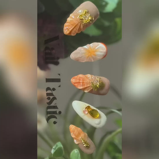Dive into the beauty of the ocean with this luxurious press-on nail set. Each nail features a stunning blend of soft coral and peach shades, reminiscent of sun-kissed shores. Adorned with intricate gold accents and charming sea-themed designs, including a sparkling seahorse and delicate seashells, this set captures the essence of marine life. Perfect for a beach getaway or to add a touch of summer to your everyday look, these nails blend elegance with a playful ocean vibe.