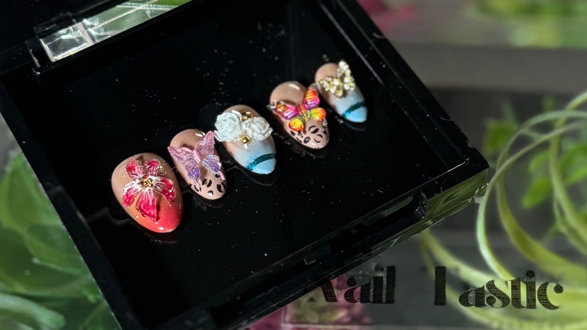 This playful yet bold set mixes floral beauty with a touch of the wild. The nude base is dressed up with pops of bright color—like fiery red petals, glittering butterflies, and crisp white roses with golden studs. Leopard print accents add a fierce edge, while blue shimmer tips bring balance and variety. The butterflies, in both 3D and painted styles, create movement and a whimsical charm, making this set feel like a garden alive with color and life.